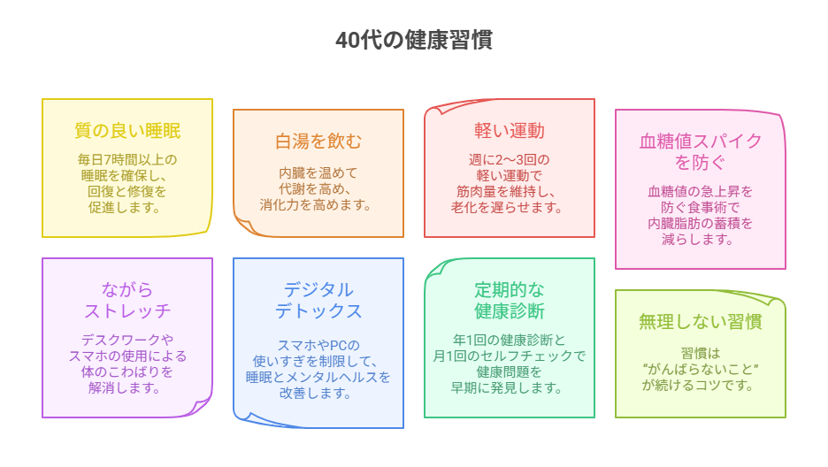 この記事では、今すぐ始められる40代向けの健康習慣リストを、運動・食事・睡眠・メンタル・定期検診などのカテゴリ別にわかりやすく紹介します。