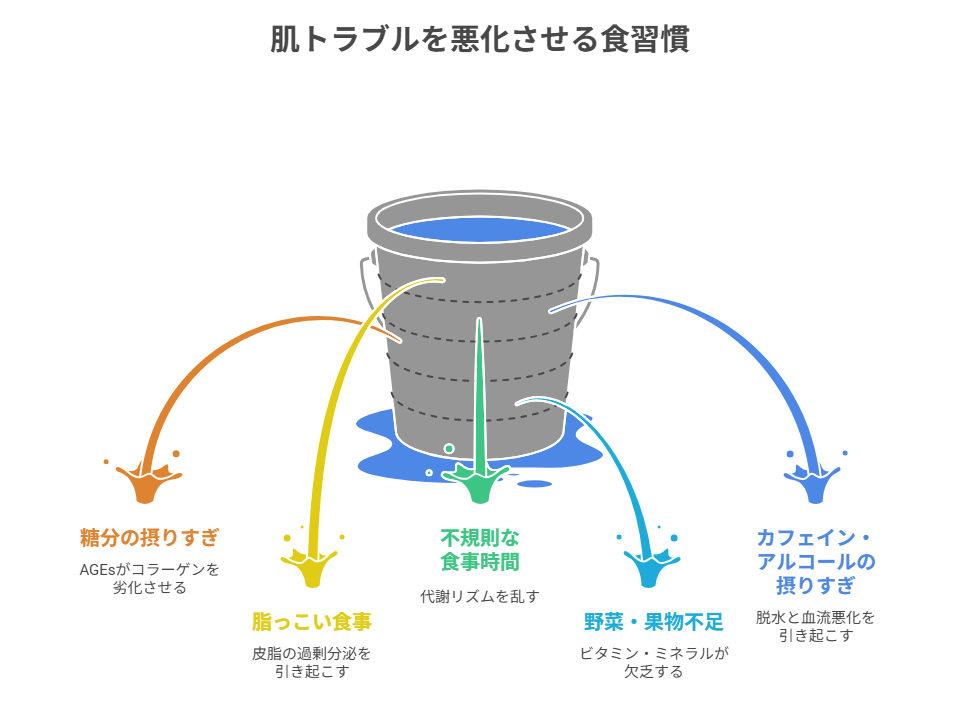 このように、肌トラブルは単なる外的要因ではなく、日々の食生活の積み重ねから生まれることが多いのです。