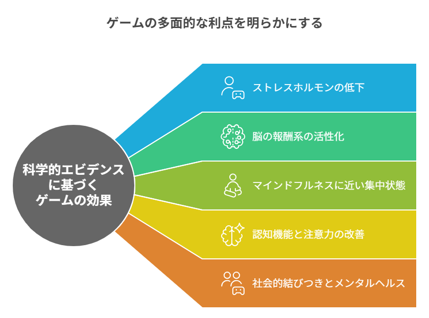 近年の研究は、ゲームが単なる娯楽を超えて「ストレス軽減」「認知機能の改善」に寄与する可能性を示しています。