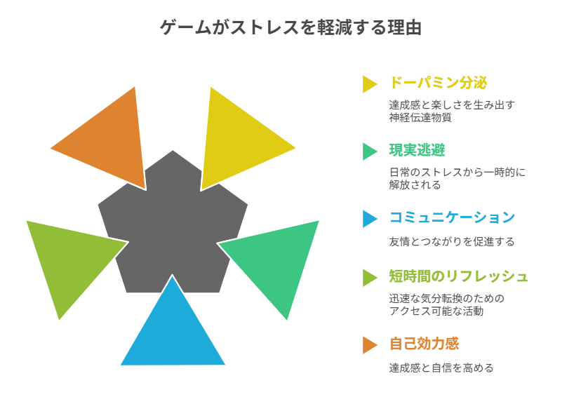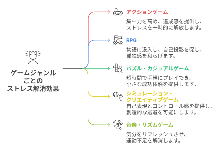 さらに、ゲームの種類によって「爽快感」「没入感」「自己表現」「協力体験」など異なる解消効果を得られるのが大きな魅力です。