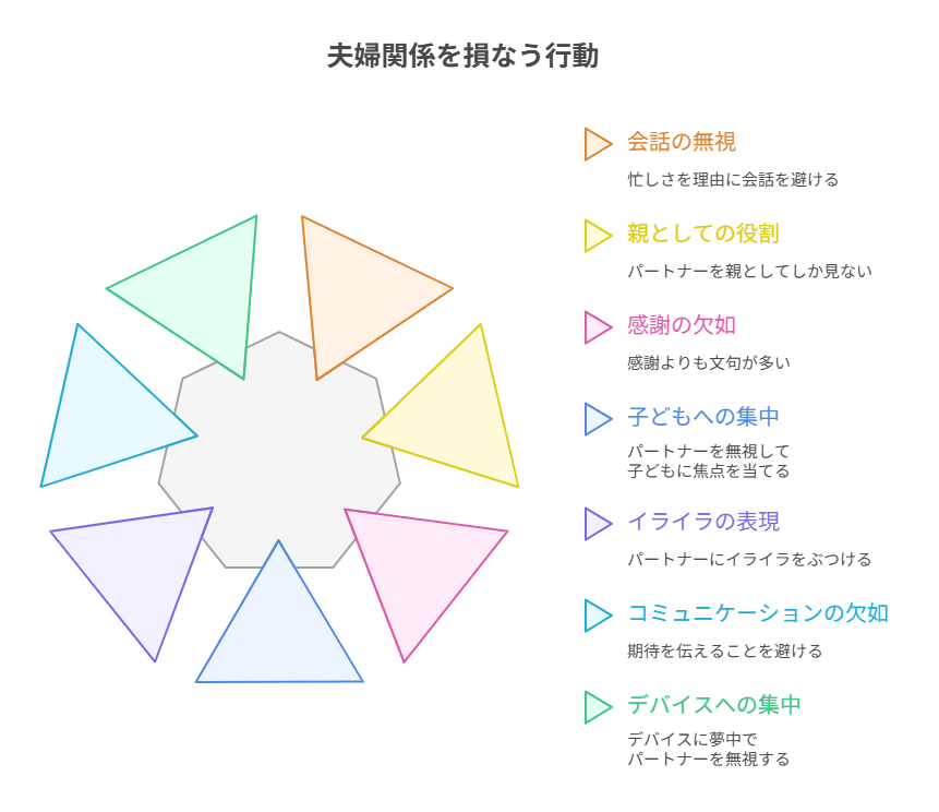 以下のような行動は、夫婦関係を少しずつ冷え込ませてしまう原因になります。