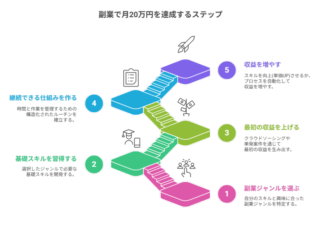 以上の5ステップを順番に積み上げることが、安定した副業収益を生むロードマップです。