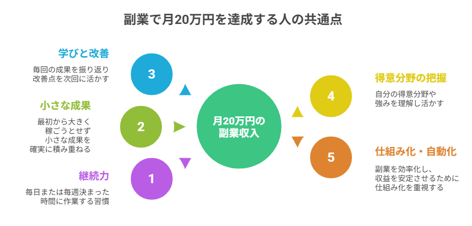 これらの行動パターンを意識して副業を進めることで、月20万円という収益は特別な才能や運に頼らずとも、十分現実的に達成可能です。