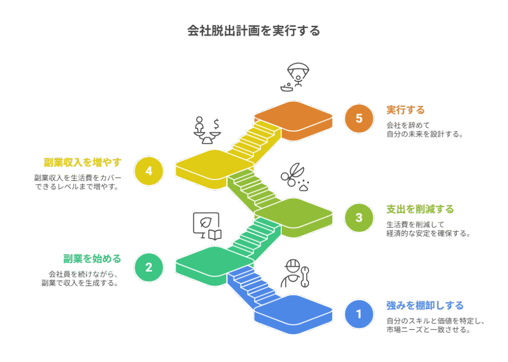 以下の5つのステップに沿って行動すれば、あなたの会社脱出計画も現実に近づいていきます。