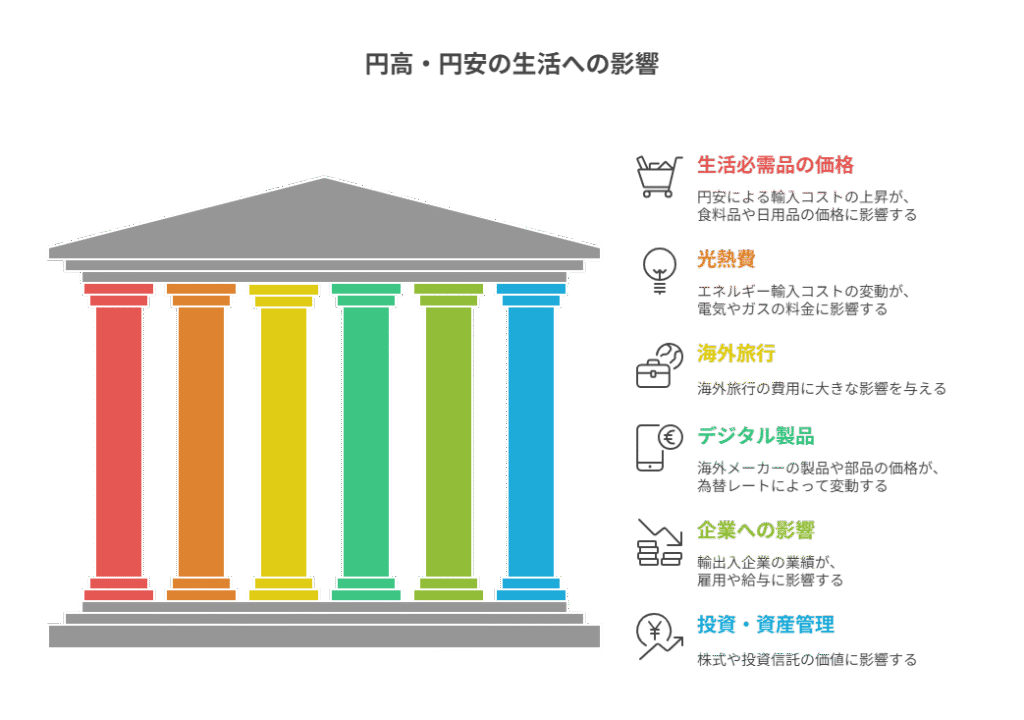 ここでは円高・円安がどのポイントに波及し、どれくらい生活に変化をもたらすのかを、具体例を交えながら整理して解説します。