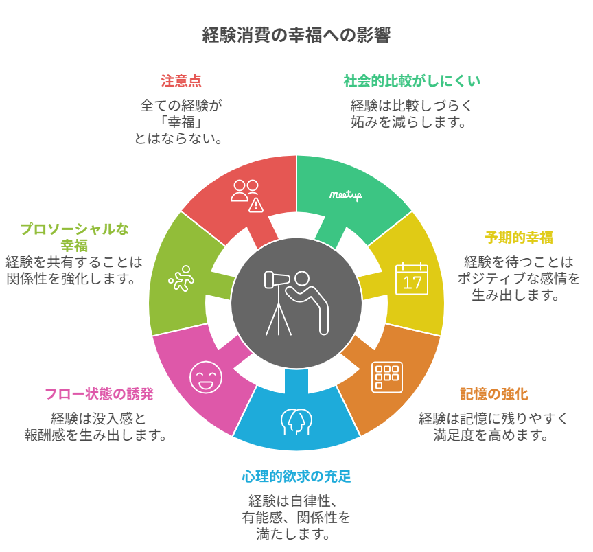 経験には人との共有が伴うことが多く、これが幸福感をさらに増幅させます。