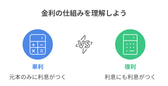 金利を理解するうえで、絶対に外せないのがこの「単利」「複利」の違いです。