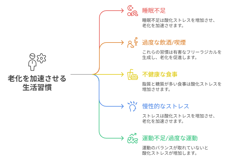 以下のような生活スタイルは、体内に「活性酸素」を大量発生させ、老化を加速させます。