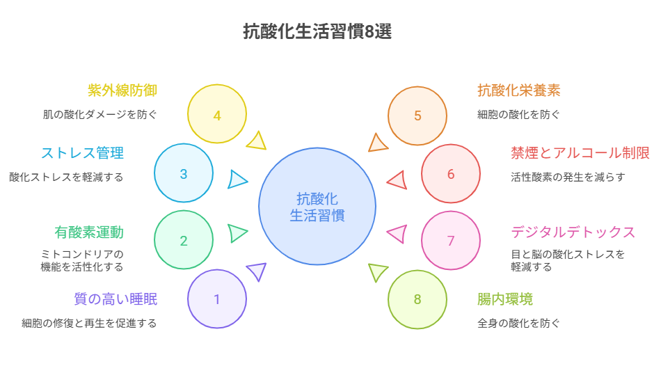 ここからは、日常生活の中で実践できる抗酸化生活習慣を8つに厳選してご紹介します。