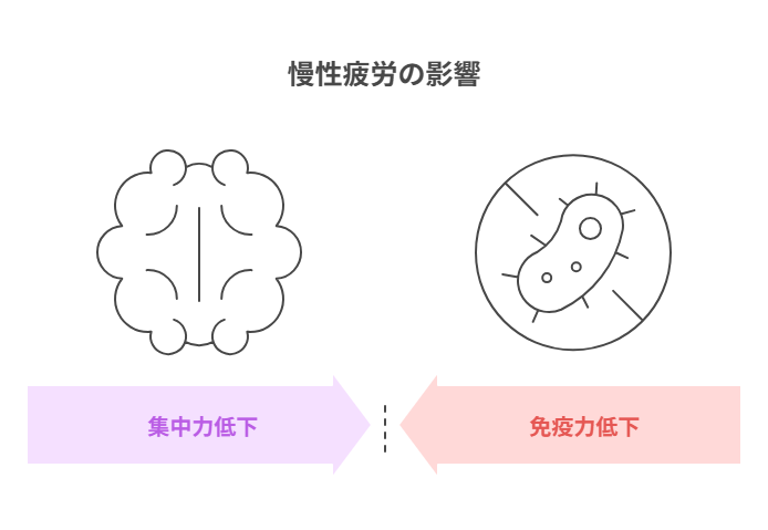 これらが積み重なると、体内の回復が十分に行われず、慢性的な疲労感につながります。