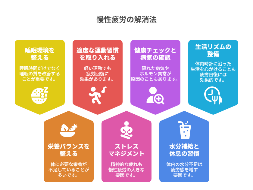 慢性疲労は原因が一つではなく、複数の要素が重なり合って起こることが多いため、自分の生活を総合的に見直すことが必要です。