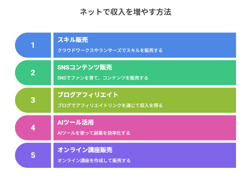 この記事では、最新トレンドを踏まえた「ネットで収入を増やす5つの最先端の方法」と、「成果を出すための思考法・実践ステップ」を分かりやすく解説します。