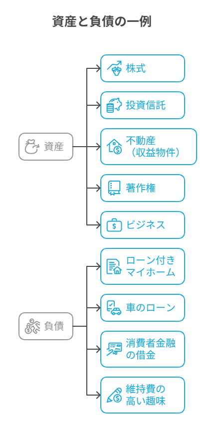 • 資産の例: 株式、投資信託、不動産(収益物件)、著作権、ビジネスなど