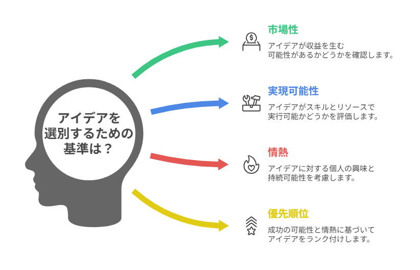 市場性、実現可能性、情熱度を総合的に判断し、複数のアイデアがある場合は優先順位をつけます。