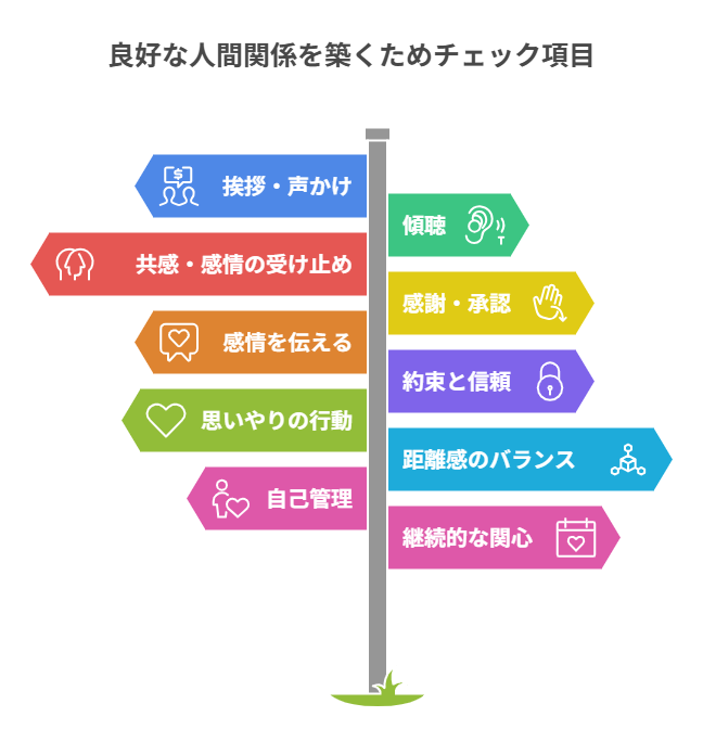ここでは、良好な人間関係を築くための習慣を項目ごとに分け、チェックリスト形式でご紹介します。