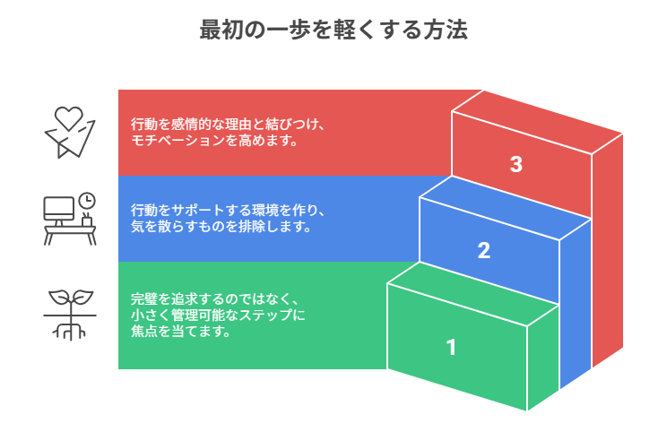 「行動したいのに動けない」状態から抜け出すためには、根性ややる気ではなく、「行動を起こしやすくする仕組み」を作ることが大切です。