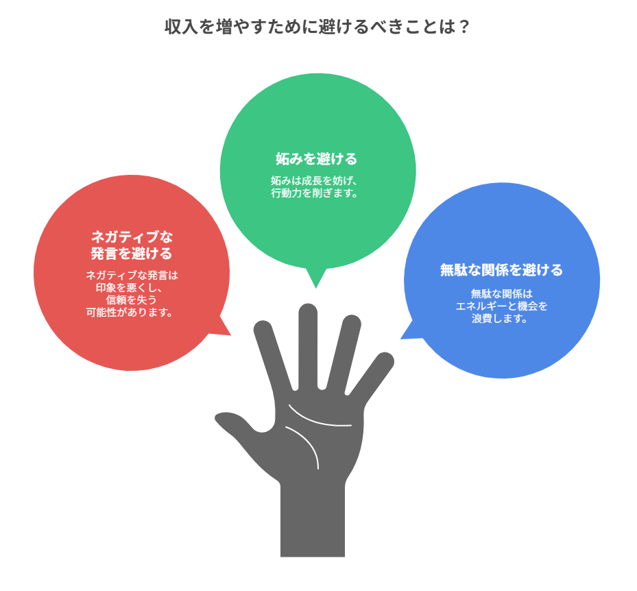 これらの「やらないこと」を意識することで、自然と信頼される人間関係が築かれ、結果的に収入アップにつながります。