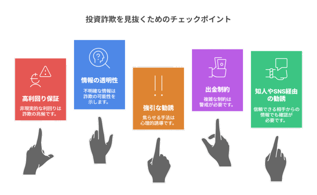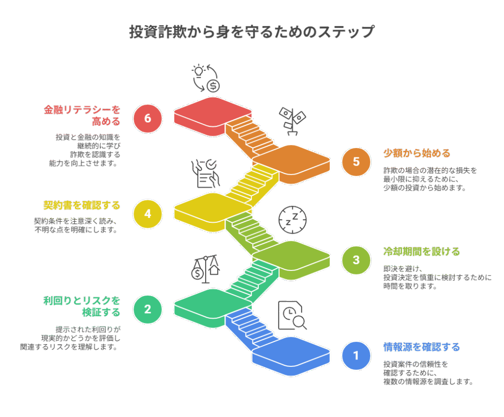 投資詐欺から身を守るためには、まず危険信号を理解し、情報の透明性や利回りの現実性、勧誘手法をチェックすることが重要です。