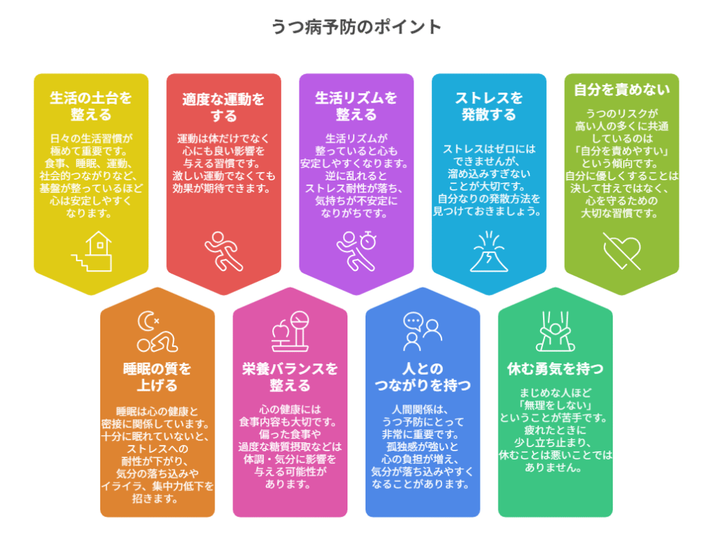うつの予防は特別なテクニックよりも、日々の生活習慣が極めて重要です。